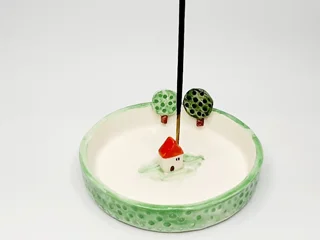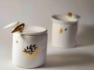 عود سوز سرامیکی دستساز شعر نوشته با پرنده لعاب طلا-نوشته ها در کوره تثبیت شده اند و کاملا ثابت و قابل شستشو میباشند. پرنده روی کار لعاب طلا میباشد. عودسوزها دارای چهار پایه کوچک میباشند.