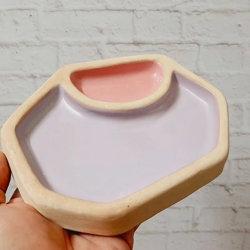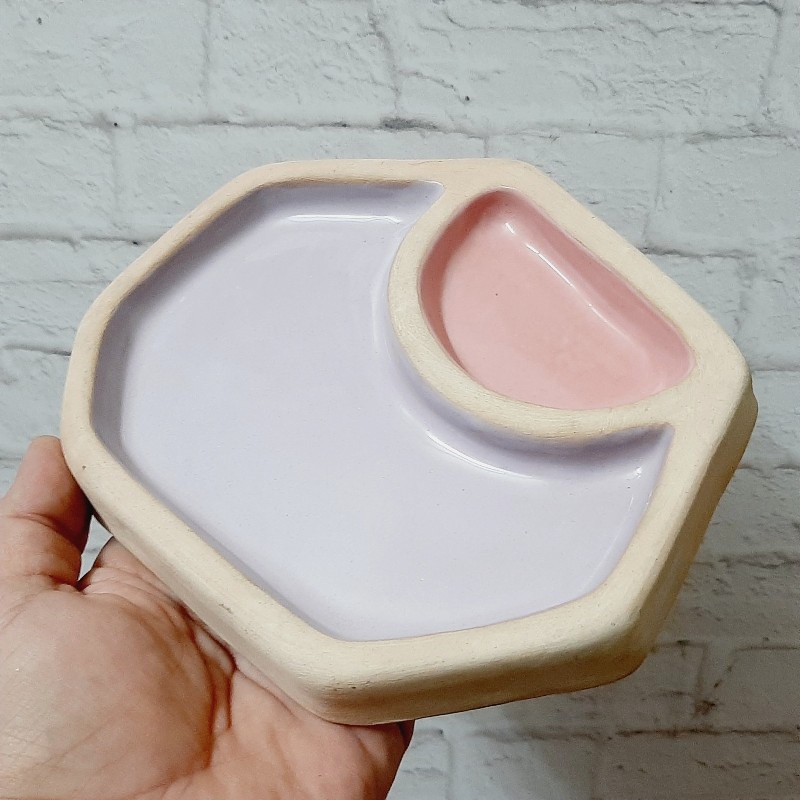 اردوخوری دو قسمتی با لعاب پاستیلی زیبا، مناسب سرو انواع مزه، ترشیجات،زیتون و یا سس و انواع شیرینیجات کوچک یا تنقلات - کاملا مصرفی و قابل شستشو میباشد.ابعاد ۱۵.۵ در ۱۸.۵ سانتیمتر- یاداوری میشود کارها کوره رفته بوده و قسمتهای رنگی لعاب میباشد و رنگ معمولی نیست.