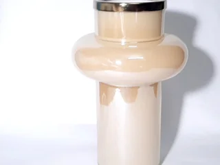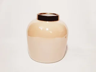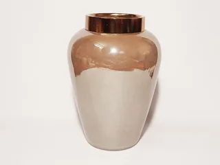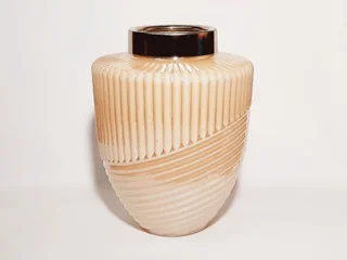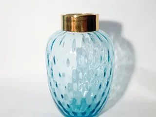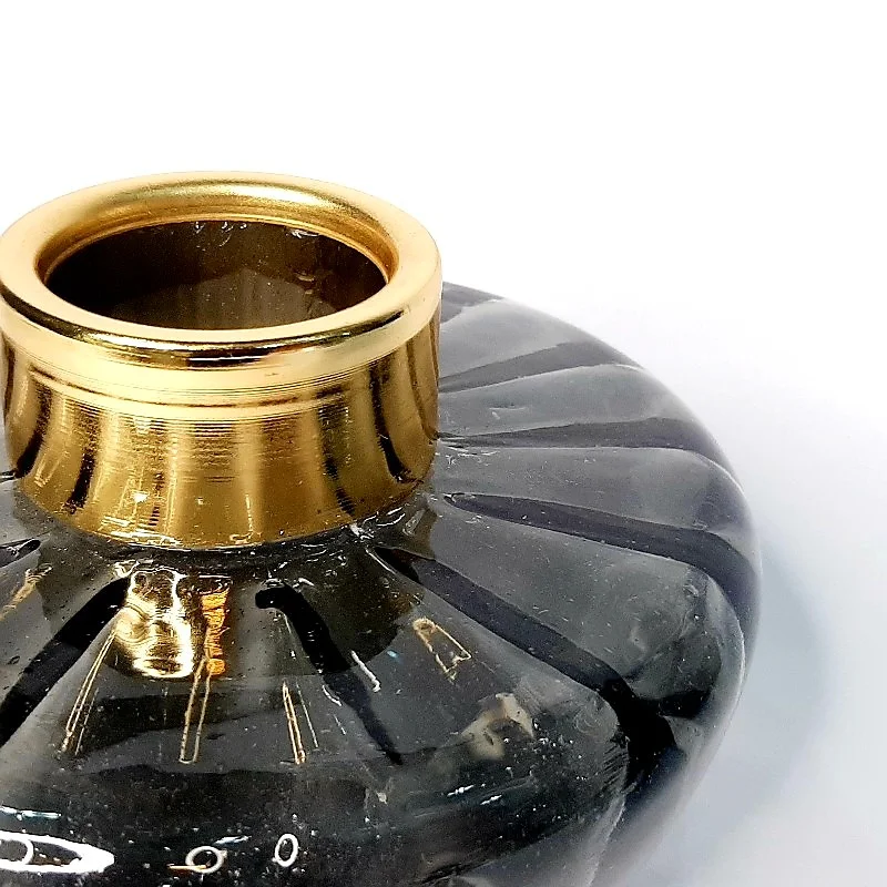 گلدان شیشه ای دستساز با لبه برنجی- قسمت طلایی از فلز برنج میباشد که رنگ آن ثابت است و تیره نمیشود. محصول فوق کاملا دستساز بوده و رنگ شیشه آنها ثابت میباشد (مواد شیشه، رنگی هستند) و بمرور پوسته یا تغییر رنگ نمیدهند.