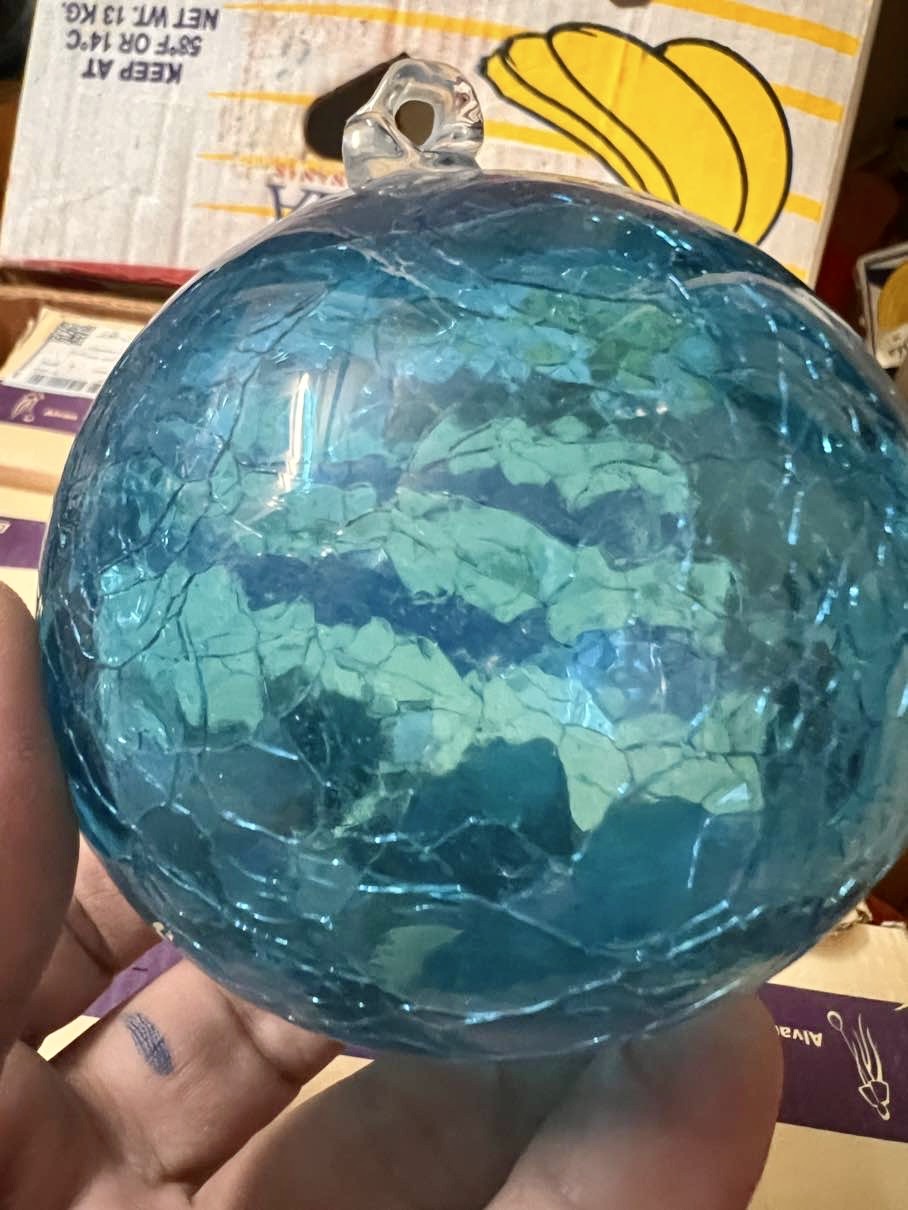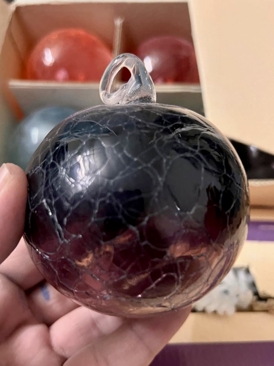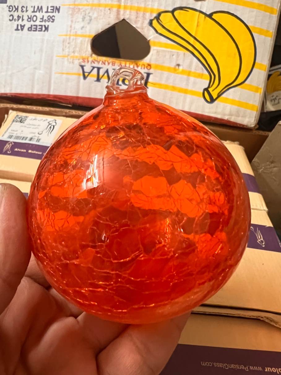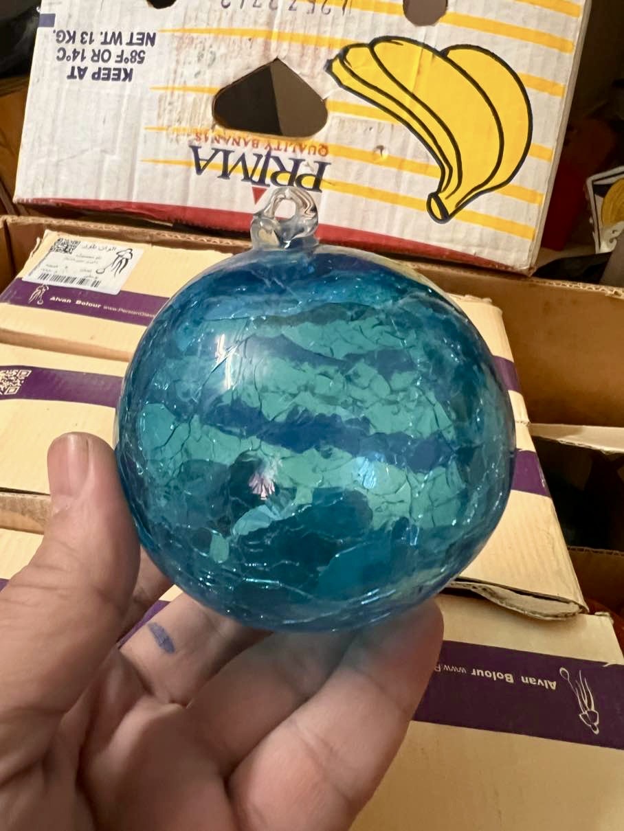 گوی های شیشه ای دستساز - دارای حلقه ی آویز یک تکه. محصول فوق کاملا دستساز بوده و رنگ شیشه آنها ثابت میباشد (مواد شیشه، رنگی هستند) و بمرور پوسته یا تغییر رنگ نمیدهند.ترک های روی گوی ها تزیینی هستند و بدلیل دو لایه بودن گوی باعث ترک بیشتر یا شکسته شدن نمیشوند.
