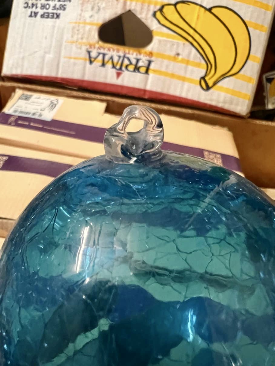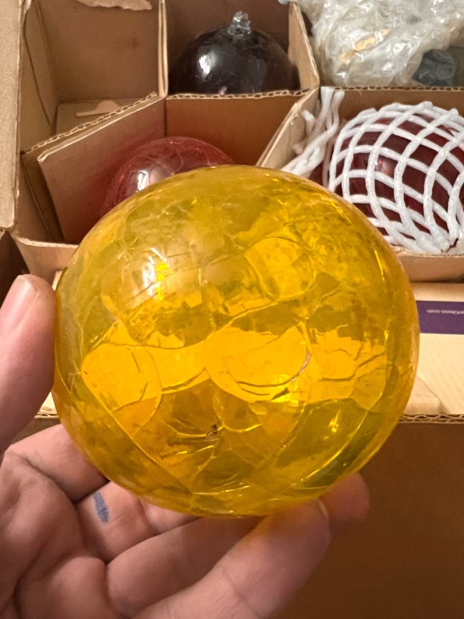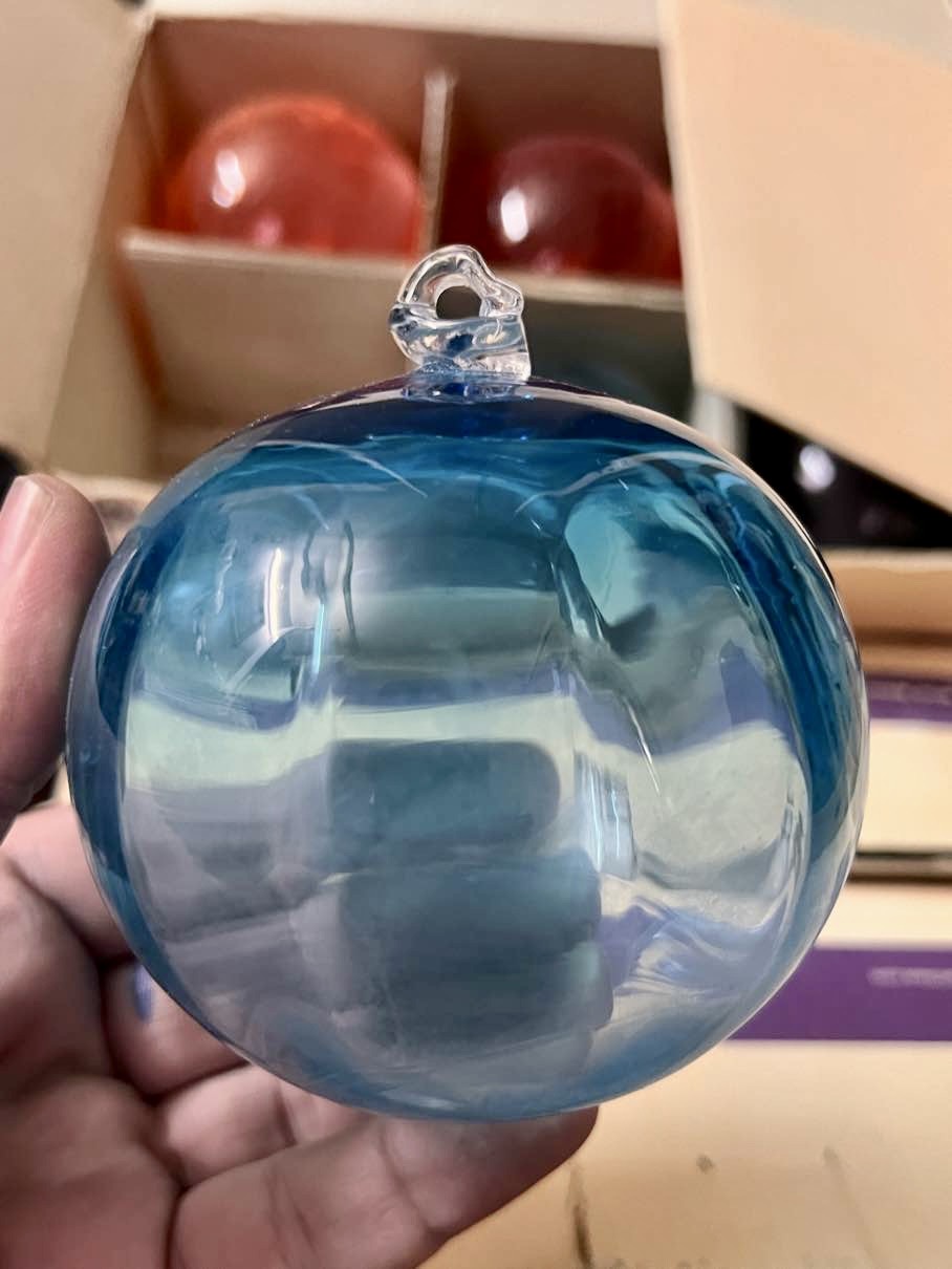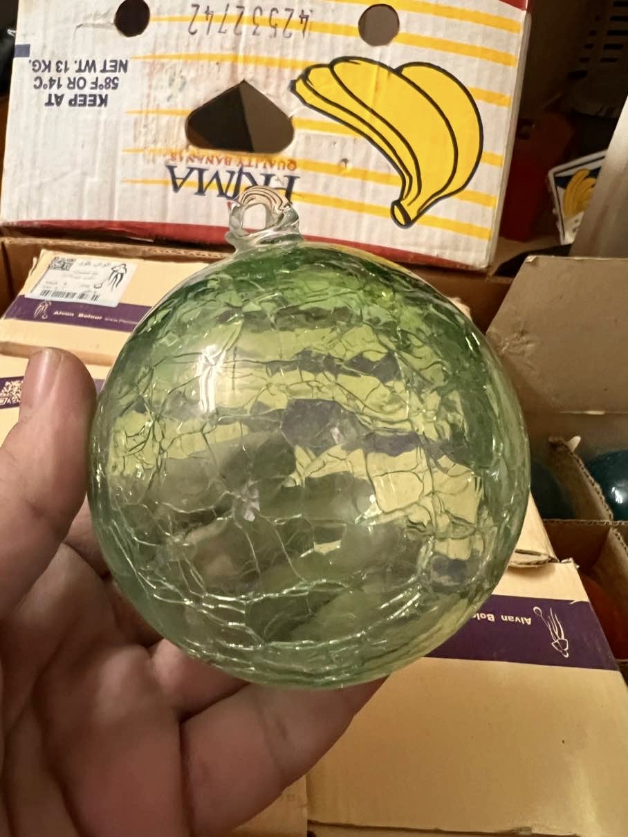 گوی های شیشه ای دستساز - دارای حلقه ی آویز یک تکه. محصول فوق کاملا دستساز بوده و رنگ شیشه آنها ثابت میباشد (مواد شیشه، رنگی هستند) و بمرور پوسته یا تغییر رنگ نمیدهند.ترک های روی گوی ها تزیینی هستند و بدلیل دو لایه بودن گوی باعث ترک بیشتر یا شکسته شدن نمیشوند.