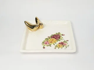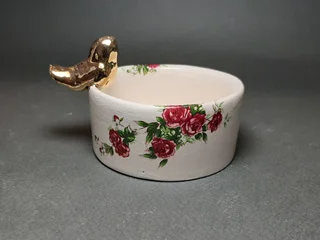 عود سوز سرامیکی دستساز گلسرخی با پرنده لعاب طلا-نوشته ها در کوره تثبیت شده اند و کاملا ثابت و قابل شستشو میباشند. پرنده روی کار لعاب طلا میباشد.