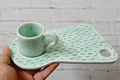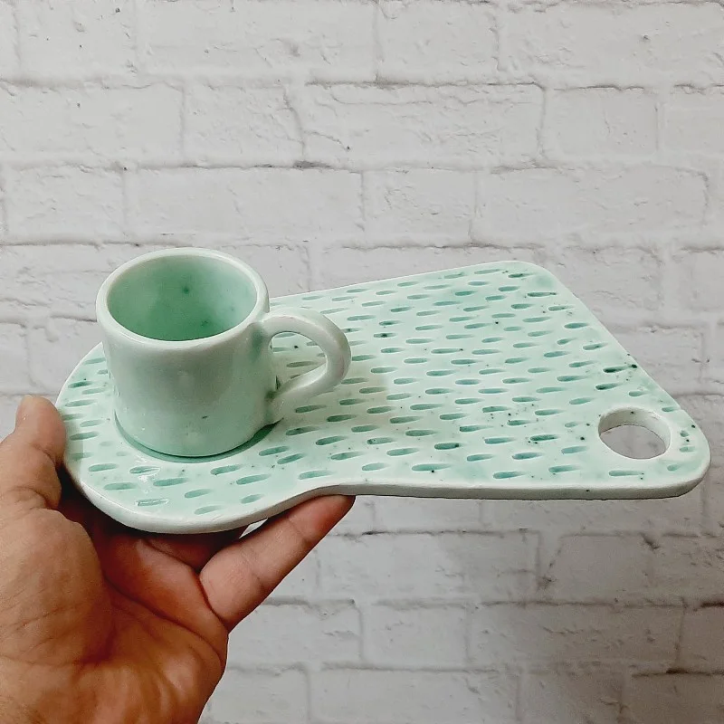 ست قهوه خوری دارای یکعدد تخته سرو کوچک مناسب کوکی و بیسکوییت و... بهمراه فنجان میباشد- ظروف سرامیکی دستساز ، کاملا مصرفی و قابل شستشو میباشند. ابعاد تخته سرو حدودا ۱۲در۲۴ میباشد.