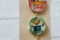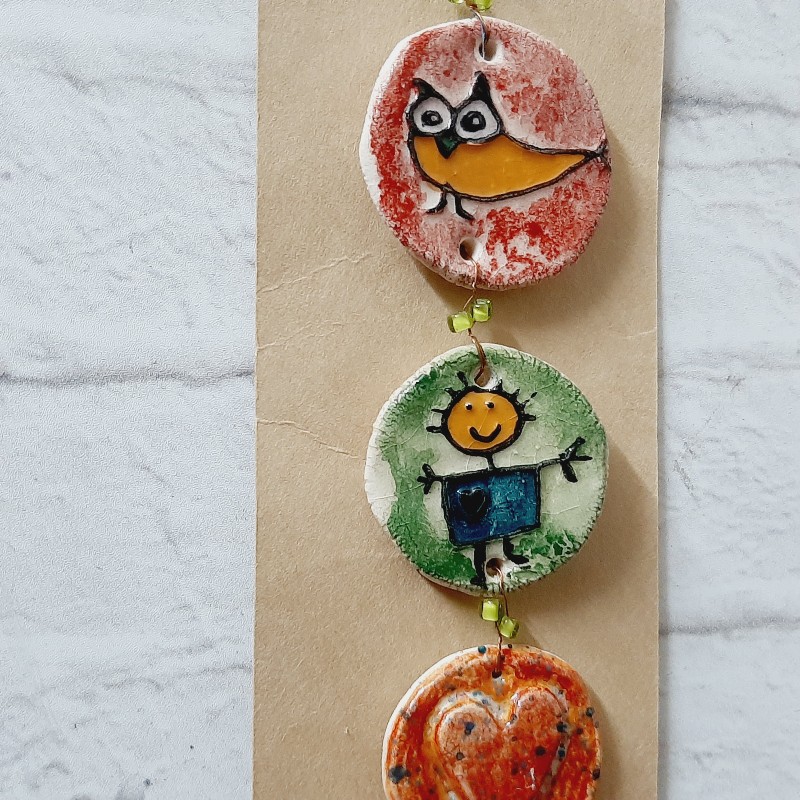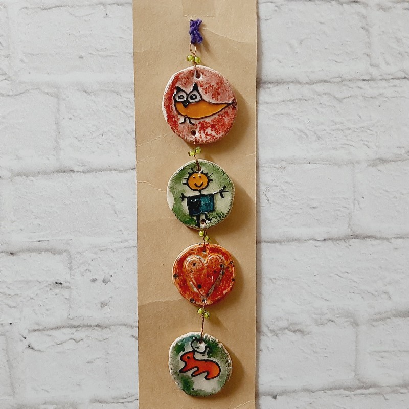 آویز سرامیکی دکوراتیو- طول ۲۰ سانت و هر مهره حدودا قطر ۴ سانت میباشد- مهره ها لعاب خورده و برجسته میباشند. کار بصورت ریسه بوده و مقوای پشت آن جهت نمایش بهتر در عکس میباشد-