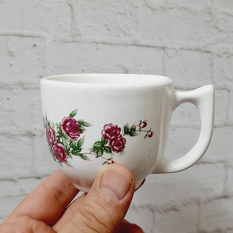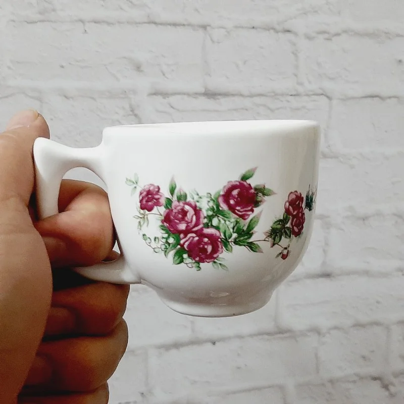 فنجان گلسرخی سرامیکی- طرح روی فنجان ها با شستشو، کمرنگ و یا پاک نمیشوند- ابعاد فنجان: ارتفاع ۷.۵ قطر ۷ سانتیمتر- کاملا مصرفی و قابل شستشو